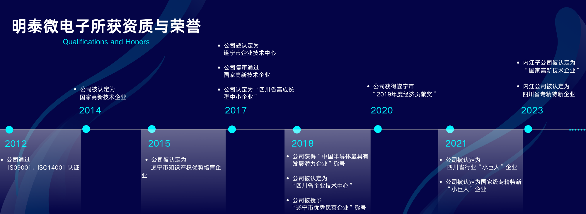 四川明泰電子科技有限公司獲得的資質(zhì)和榮譽 ?2012年,公司通過ISO9001和ISO14001認證; 2014年,公司認定為“國家高新技術(shù)企業(yè)”; 2015年,公司認定為“遂寧市知識產(chǎn)權(quán)優(yōu)勢培育企業(yè)”;